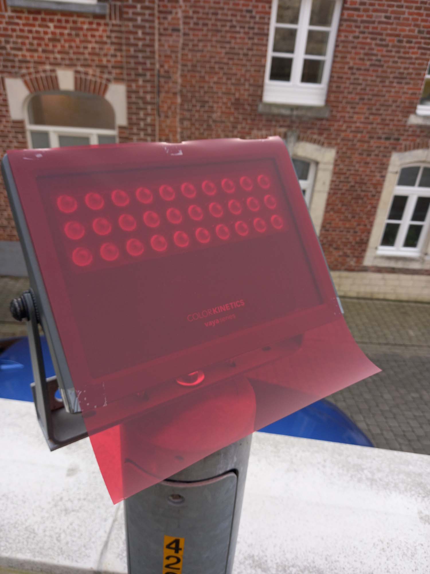 Wenn die Lampen so hoch hängen, dass eine Hubarbeitsbühne benötigt wird, können Sie günstig und bequem ein paar Baulampen ausleihen oder mieten und die Filter bestellen, mit denen die Fassade rot beleuchtet werden kann.