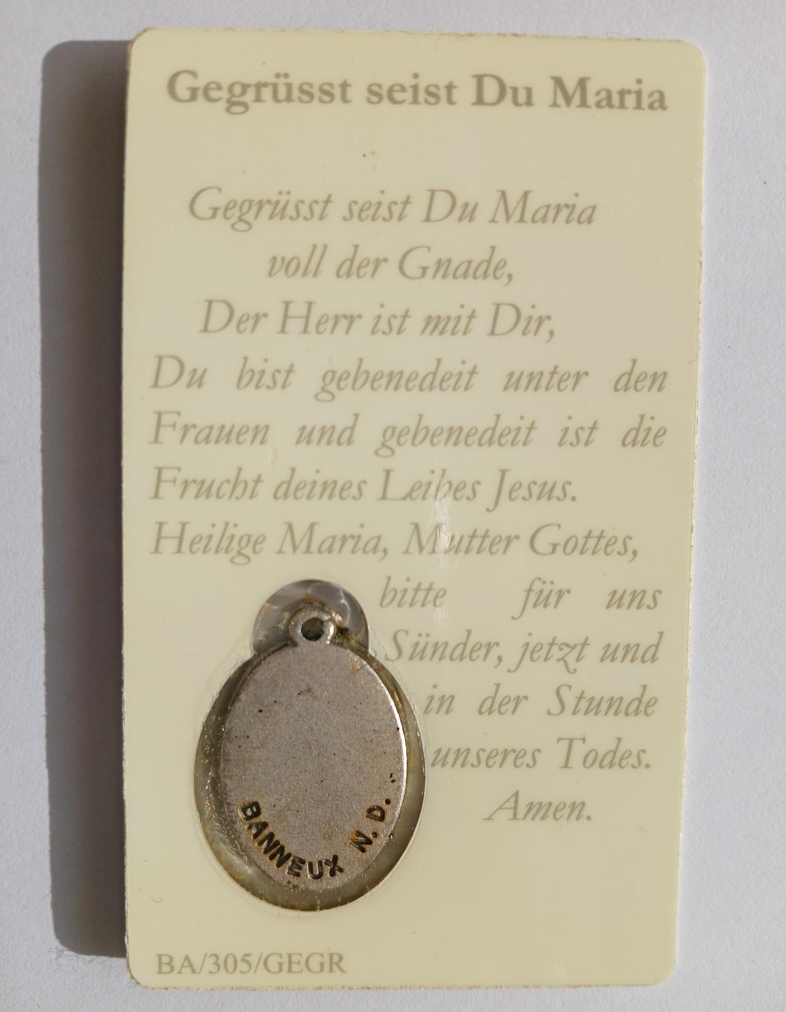 Mit dieser Karte in Ihrer Brieftasche oder der Medaille auf Ihrer Halskette können Sie dieses einfache Gebet zu Maria persönlich mitnehmen und die Gottesmutter überall und jederzeit grüßen.