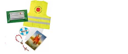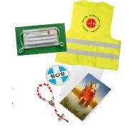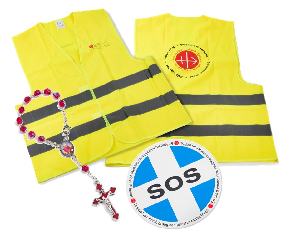 Der Heilige Christophorus und eine Warnweste bieten Ihnen unterwegs Sicherheit. Und wenn Ihnen doch etwas zustoßen sollte, dann informiert dieser SOS-Sticker die Helfer, dass sie einen Priester kontaktieren sollen.