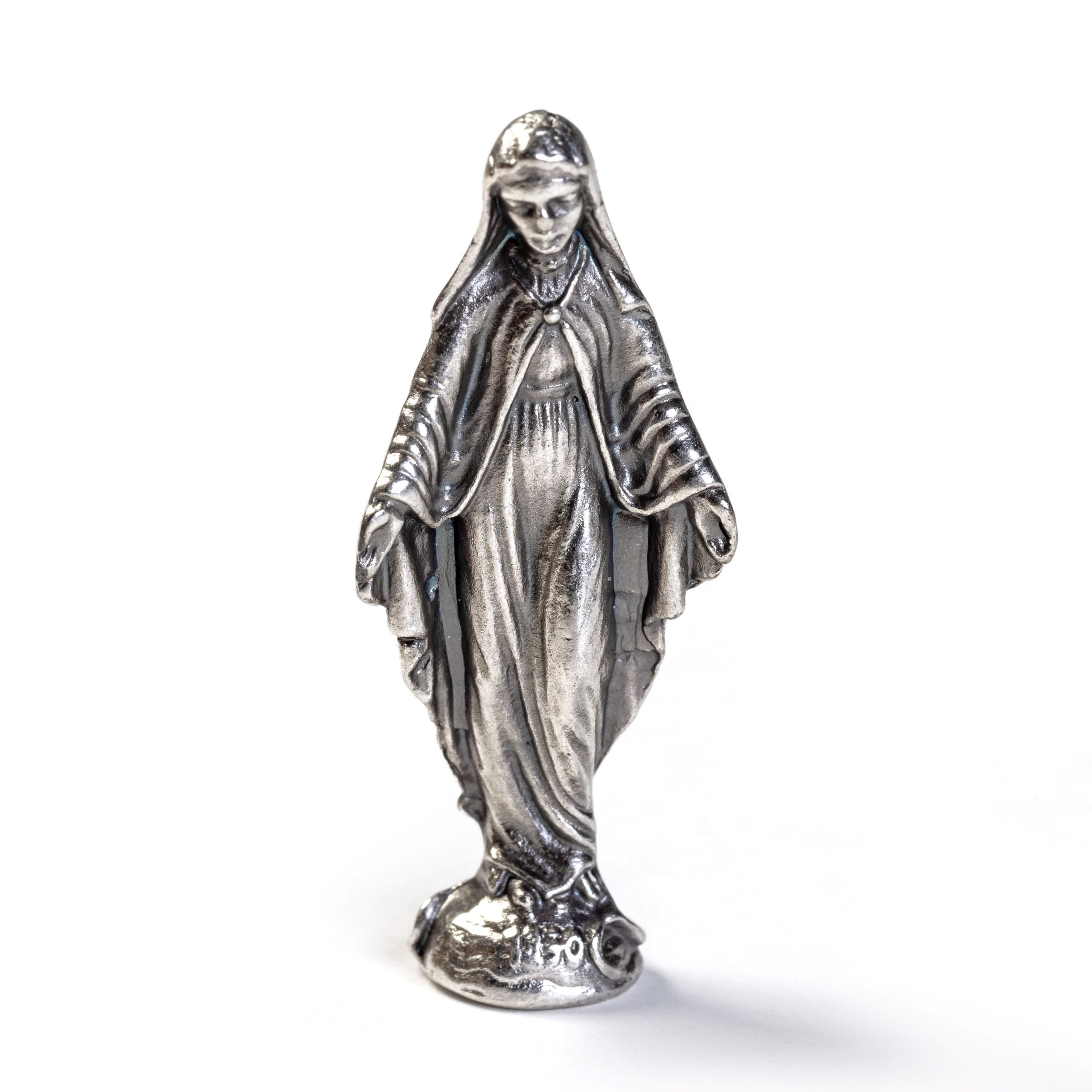Möchten Sie die Gegenwart und den Schutz der Segen Marias mit sich führen, wenn Sie unterwegs sind oder auf einer Pilgerreise sind? Sie können diese silberfarbene Marienstatue im Reiseformat überall und jederzeit mitnehmen.