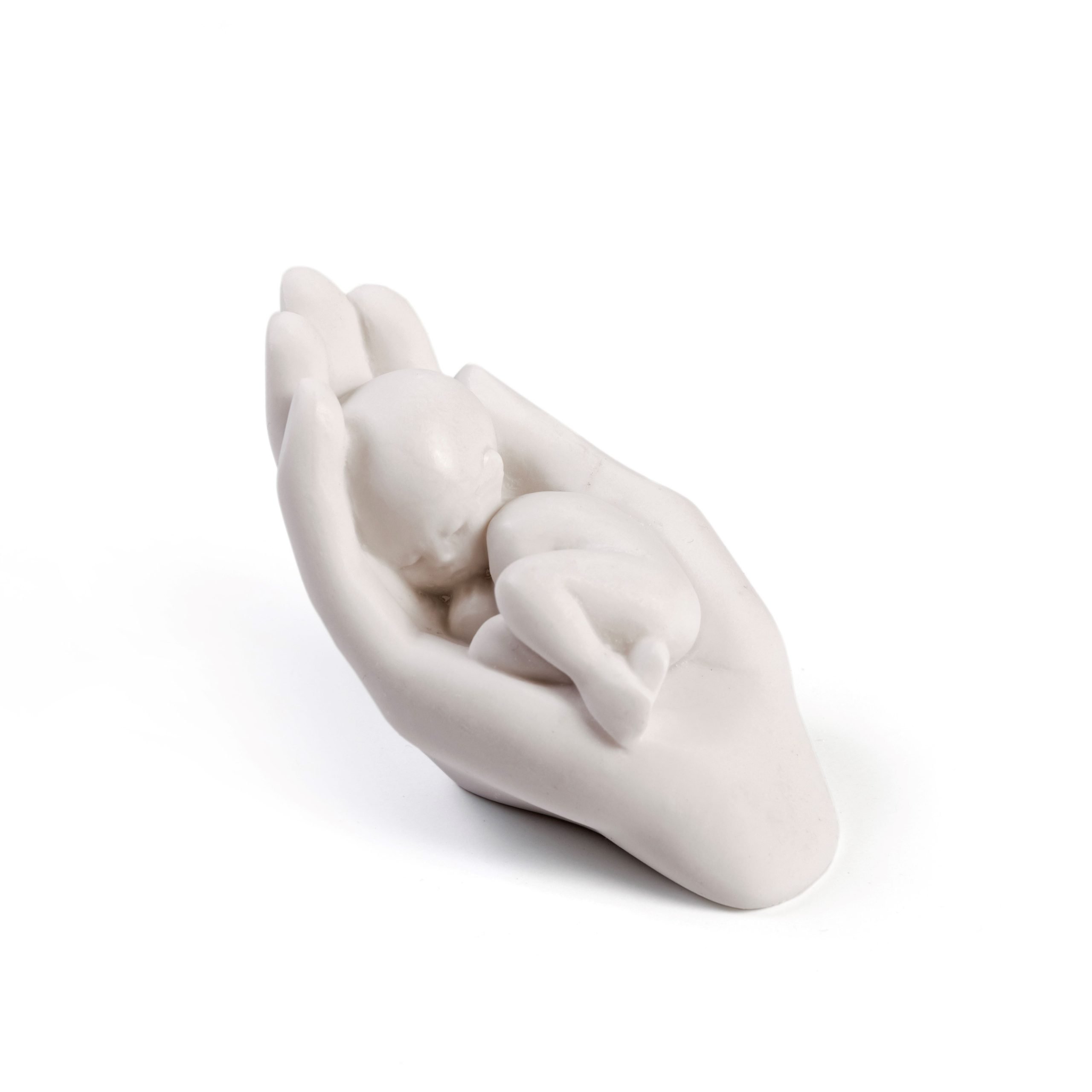 Statue eines Kindes, das geborgen in einer Hand liegt