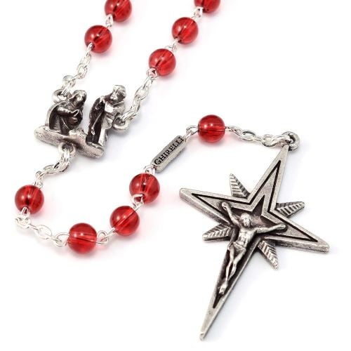 Dies ist ein richtiger Weihnachtsrosenkranz mit einem sternförmigen Kreuz, roten Perlen und der Geburt im Herzen.