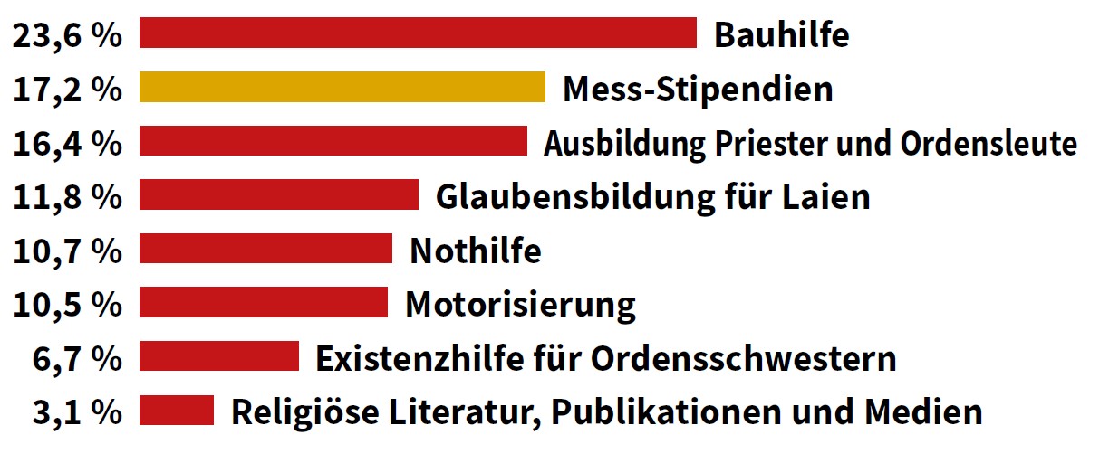 Die Ausbildungshilfen für Priester, Ordensleute und Laien machten 28,2 Prozent der gesamten Hilfe aus, Mess-Stipendien für Priester und Existenzhilfen für Schwestern insgesamt 23,9 Prozent.