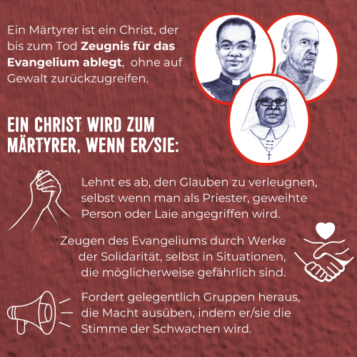 Papst Franziskus fährt in seiner Botschaft fort: „Brüder, Schwestern, es wird immer Märtyrer unter uns geben. Das ist ein Zeichen dafür, dass wir auf dem richtigen Weg sind.“ Die Tatsache, dass es Märtyrer gibt, bedeutet, dass es Menschen gibt, die ihr Leben riskiert haben, um Jesus nachzufolgen, um nach seiner Botschaft zu leben und sein Evangelium der Liebe, des Friedens und der Brüderlichkeit in der Welt zu verkörpern. Sie haben ihn weder verleugnet noch vergessen, sondern sind fest in ihrem Glauben geblieben und haben so ihre Treue zu Jesus Christus bewiesen.